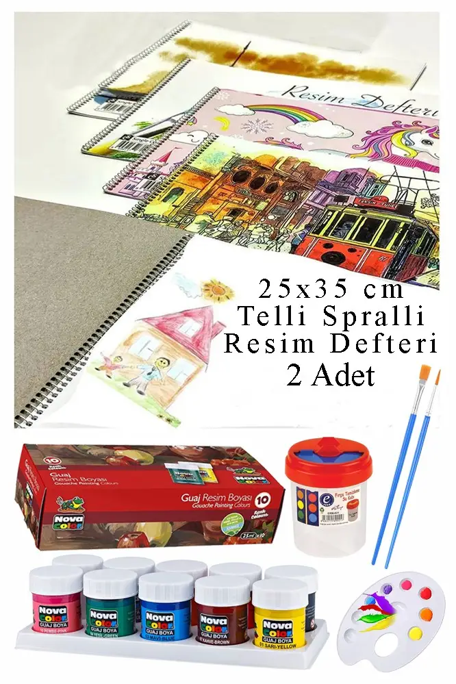Ürün Adı: 10 Renk Guaj Boya Nova Color 25x35 cm Telli Spralli Resim Defteri Palet Resim Fırçası 15 Yaprak Guajboya Resim Defteri