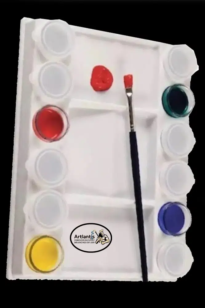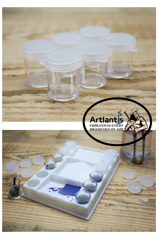 12 ayrı şeffaf kap içeren beyaz plastik boyama paletleri. Boyaları saklamak için şeffaf plastik kaplar ve kapaklar.