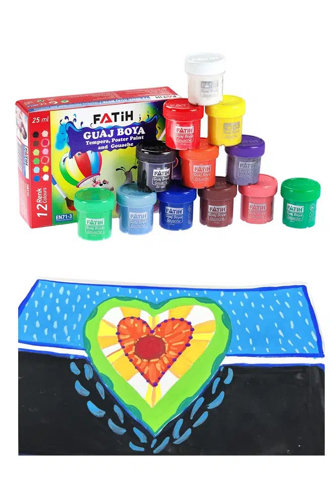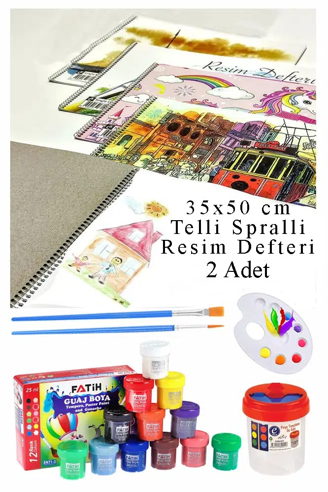 Ürün Adı: 12 Renk Guaj Boya Fatih 25x35 cm Telli Spralli Resim Defteri Palet Resim Fırçası 15 Yaprak Guajboya Resim Defteri