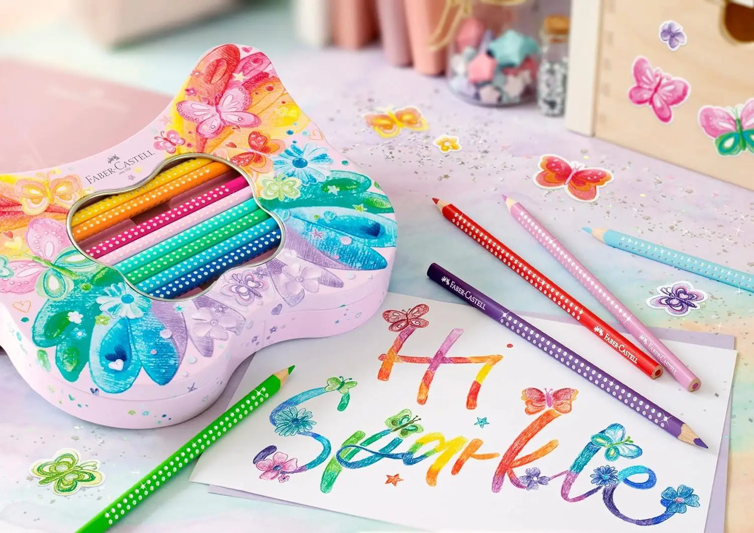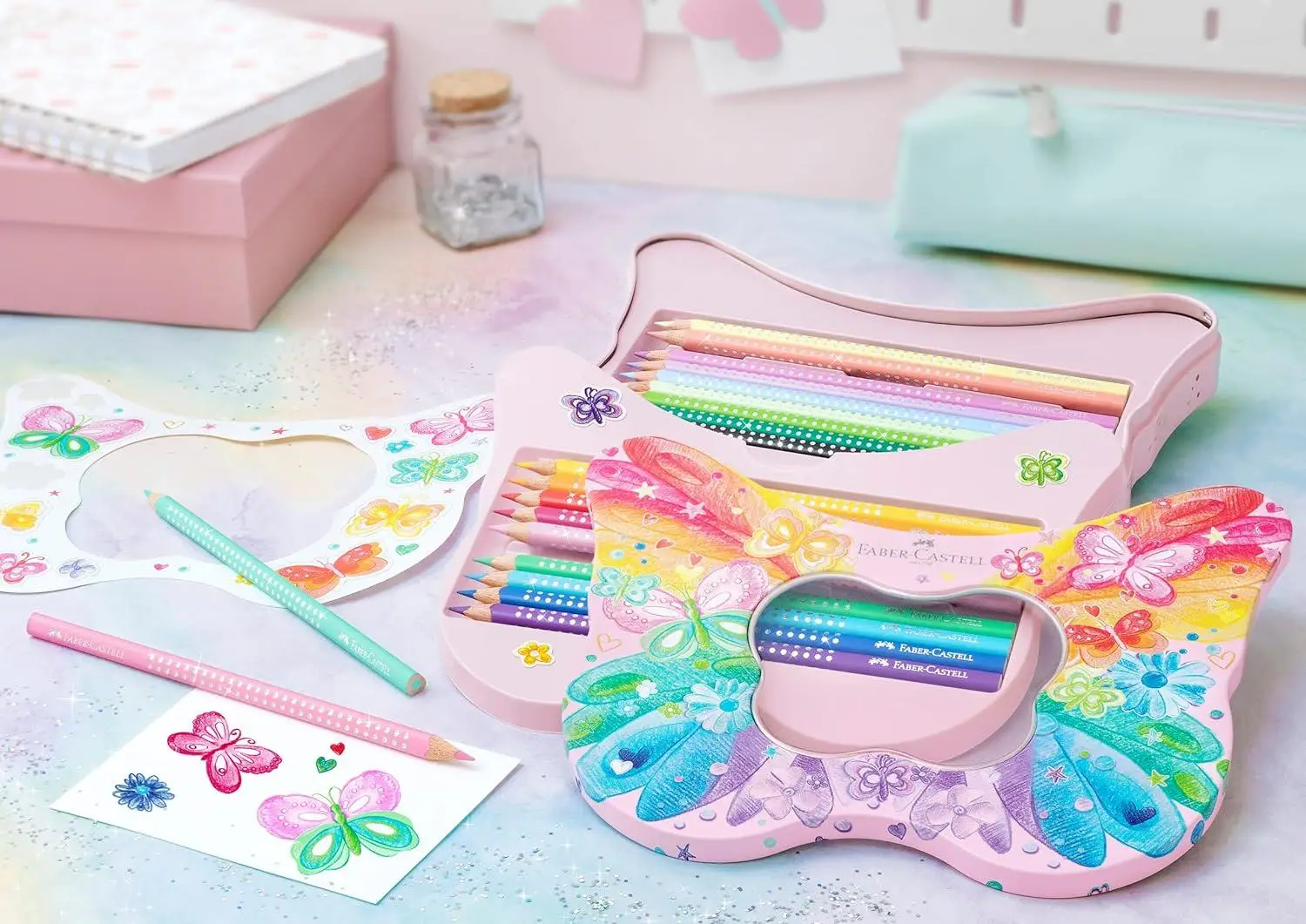 Ürünün Ayrıntıları: Sette 12 adet standart renkte ve 8 adet pastel renkte boya kalemi ve kelebek çıkartmaları bulunur