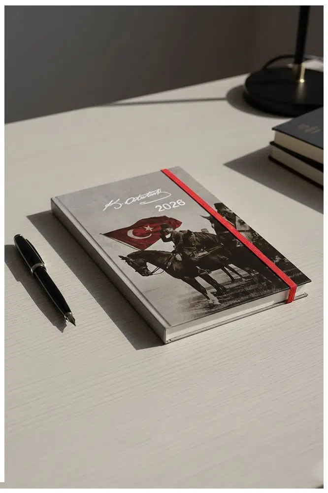 Ürün Adı: 2026 Atatürk Ajanda Premium Sert Kapak Özel Baskı 17x24 cm Lastikli Ajanda Atatürk Kapaklı Gümüş Gri OFS907ATA