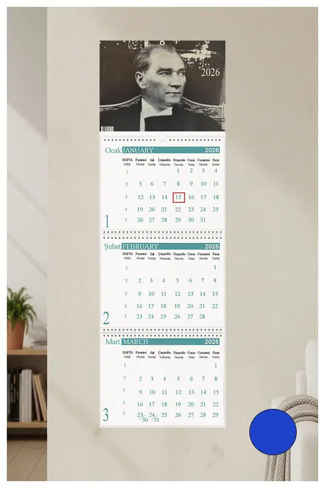 Ürün Adı: Artmaster 2026 Duvar Takvimi Atatürk Resimli 3 Aylık Gemici Takvimi Resimli NO 3 Jumbo Boy Askılı Spiralli Takvim Yeni Yıl Mavi