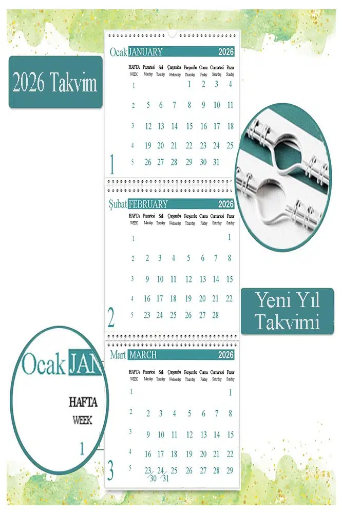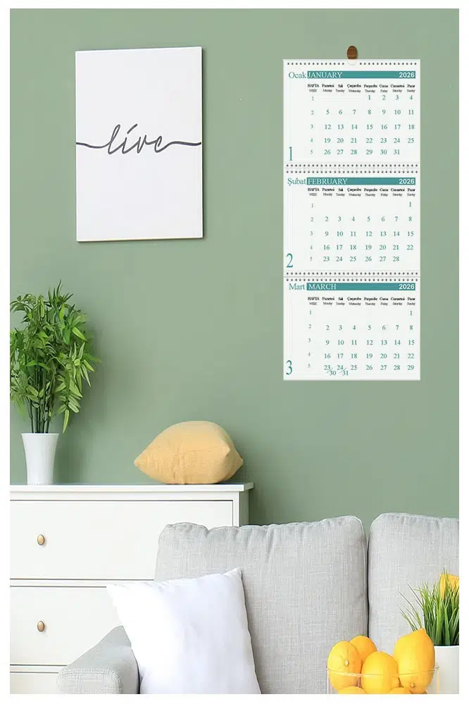 ·2026 Duvar Takvimi, Aralık 2025'ten Ocak 2027'ye kadar 14 ayı kapsar. Sayfa başına 3 ay vardır, böylece bu duvar takvimiyle planlarınızı geçmiş, güncel ve gelecek ay görünümlerinde düzenleyebilirsiniz. Ayrıca, her ayı renkli ve özgün bir desenle tasarlıyoruz.