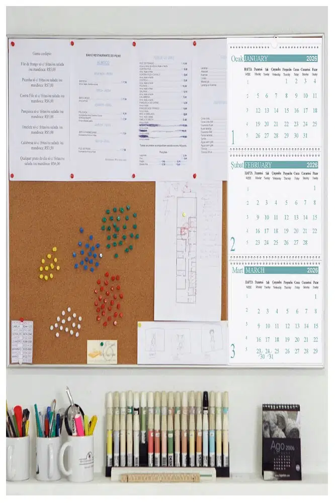 ·Tek bir sayfada katlanmış 3 aylık bir ekran bulunur, bu da onu aylık bir takvim gibi gösterir ve aynı anda birden fazla yerde kullanmak için kullanışlı hale getirir.