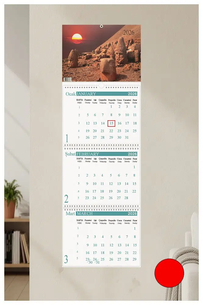 Ürün Adı: Artmaster 2026 Duvar Takvimi Manzara Resimli 3 Aylık Gemici Takvimi Resimli NO 3 Jumbo Boy Askılı Spiralli Takvim Yeni Yıl Kırmızı