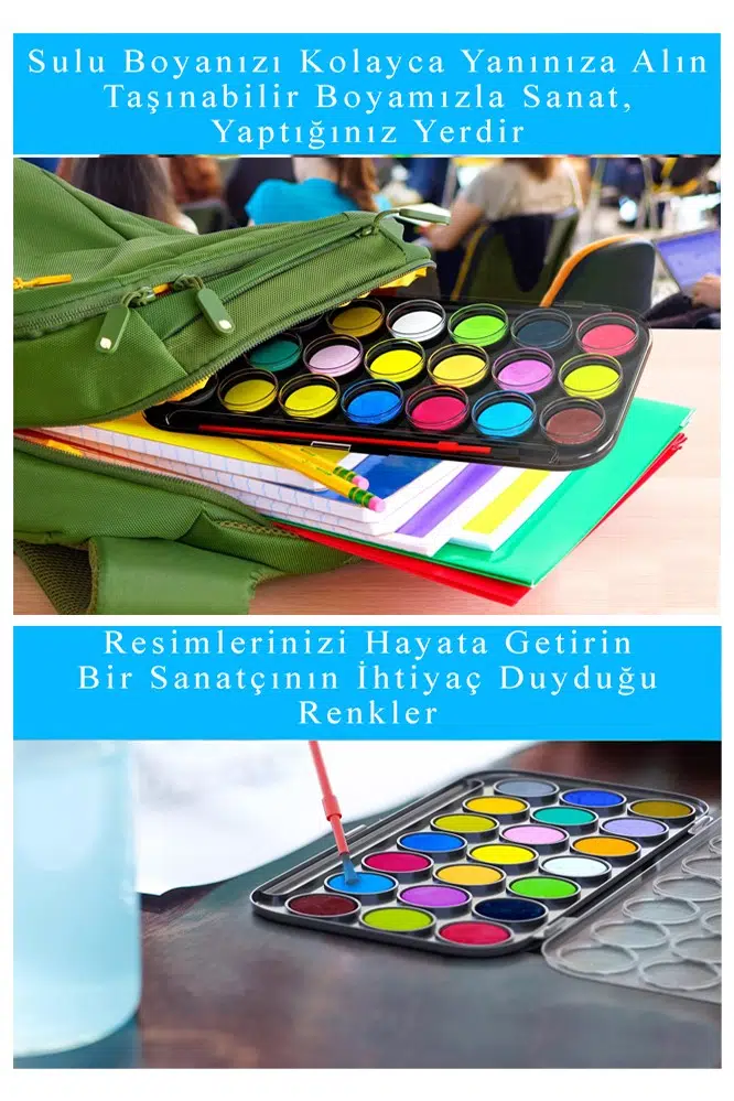 Ürün Adı: 21 Renk Sulu Boya 1 Paket Fırça Hediyeli 21 li Suluboya Canlı Renkler 28 mm Boya Çapı Büyük Boy Brons