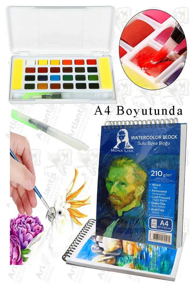 Ürün Adı: 24 Renk Tablet Sulu Boya ve A4 Telli Suluboya Bloğu Kağıdı A4 210gr 20 Yaprak İnce Dokulu Taş Suluboya Plastik Kutulu