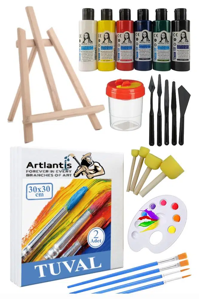 Ürün Adı: 30x30 Tuval Seti 1 Paket Masa Üstü Şövale Monalisa Akrilik Boya Plastik Spatula Resim Fırçası Palet Ponpon Sünger Fırça
