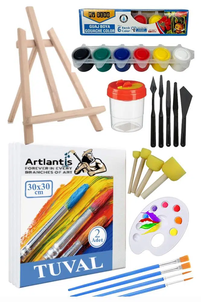 Ürün Adı: 30x30 Tuval Seti 1 Paket Masa Üstü Şövale Mydido Akrilik Boya Plastik Spatula Resim Fırçası Palet Ponpon Sünger Fırça