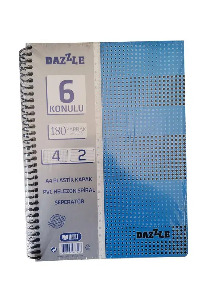 Ürün Adı: 4+2 Ayraçlı Defter 6 Konulu 180 Yaprak 1 Adet 4 Kareli 2 Çizgili Spralli Plastik Kapak Seperatörlü