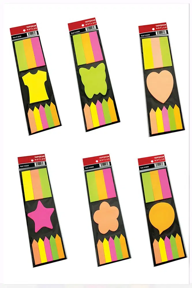 | Etiketler | 6 Farklı Şekilli Yapışkanlı Not Kağıdı 5 Renk 6 Adet Neon Renkler Neon Ayraç Karışık Şekilli Fosforlu Not Kağıdı |
