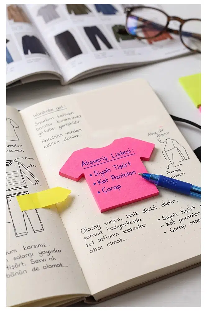 Farklı Şekil ve Boyutlar: Sette hem klasik dikdörtgen hem de özel kesim formlarında not kağıtları bulunur. Dikdörtgen şekiller hızlı notlar ve işaretlemeler için idealdir.