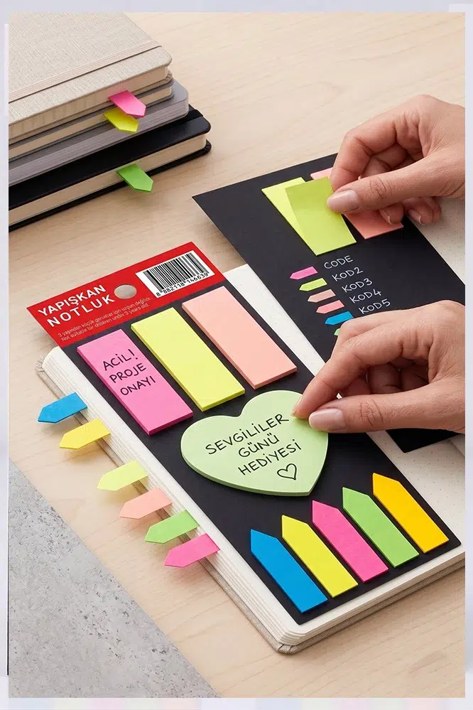 Bu, çalışma alanınızı ve notlarınızı düzenlemeniz için tasarlanmış çok amaçlı bir yapışkanlı not kağıdı setidir. İşte ürünün temel özellikleri: