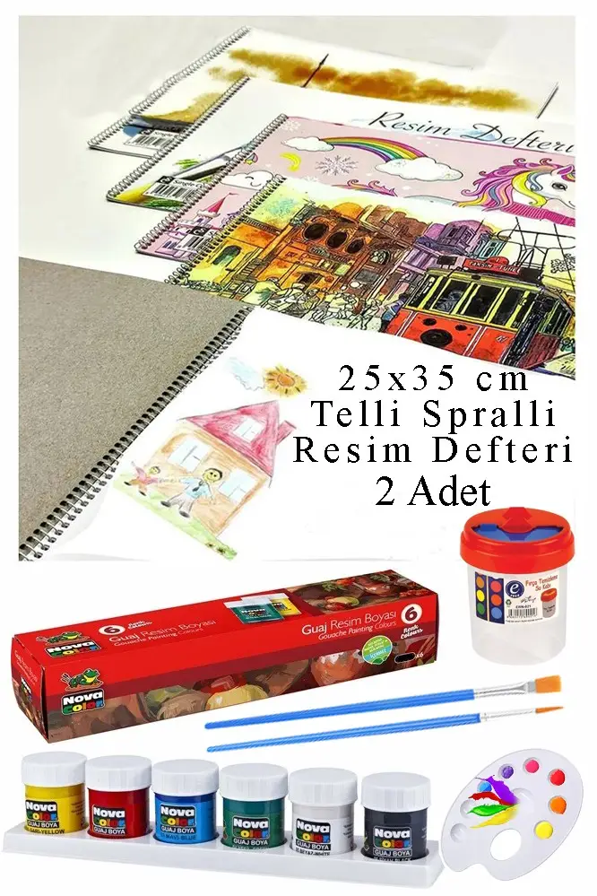 Ürün Adı: 6 Renk Guaj Boya Nova Color 25x35 cm Telli Spralli Resim Defteri Palet Resim Fırçası 15 Yaprak Guajboya Resim Defteri