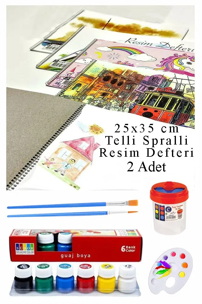 Ürün Adı: 6 Renk Guaj Boya Südor 25x35 cm Telli Spralli Resim Defteri Palet Resim Fırçası 15 Yaprak Guajboya Resim Defteri