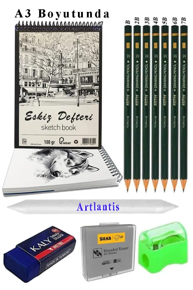 Ürün Adı: A3 120 gr Eskiz Defteri Telli 7 Adet Dereceli Kalem Çizim Seti Pastel Dağıtma Silgi Karakalem Eskiz Seti Kalemtraş