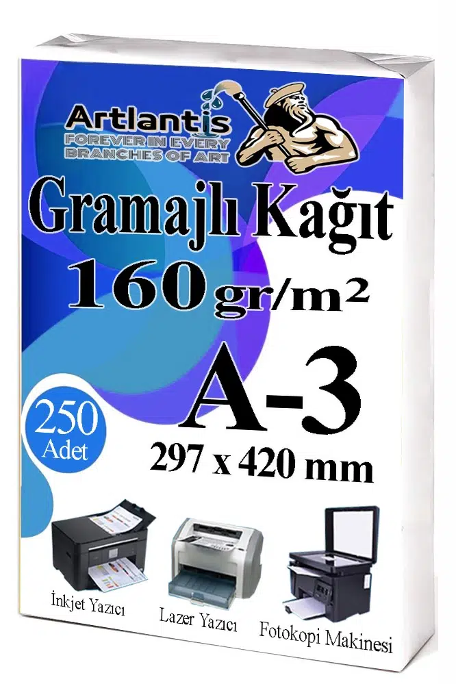 Ürün Adı: Artlantis A3 Gramajlı Fotokopi Kağıdı 250 Adet 160 gr Sertifika Kağıdı Kalın Kağıt Baskı Tüm Yazıcılara Uyumlu 29.7x42cm Ofis Büro