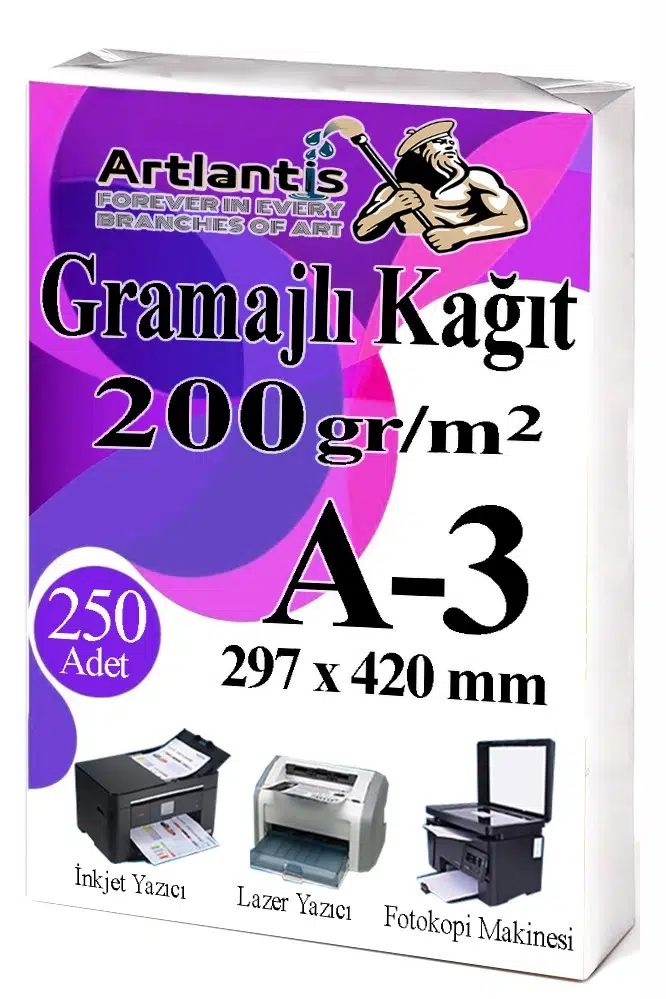 - Artlantis A4 Sertifika Kağıdı Kalın Kartuşlu Mürekkepli Tüm Yazıcılara Uygun 200 gr. (Tüm Yazıcılar için Optimum kalınlıktadır.) A3 (29.7cm x 42cm) Sıvı Mürekkepli Yazıcılarda Dağılma Problemi olmaz. Mürekkebi hemen emer. Kartuşlu ve Lazer tüm yazıcılara uygundur.