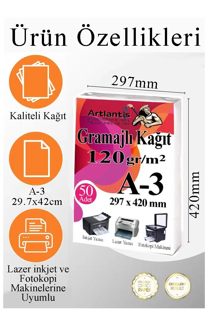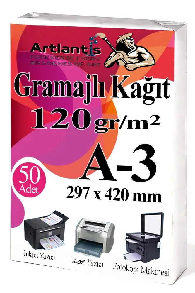 Ürün Adı: Artlantis A3 Gramajlı Fotokopi Kağıdı 50 Adet 120 gr Sertifika Kağıdı Kalın Kağıt Baskı Tüm Yazıcılara Uyumlu 29.7x42cm Ofis Büro