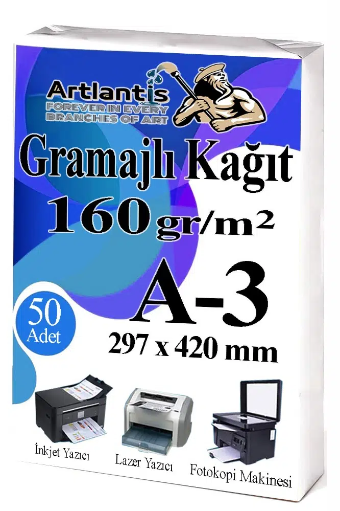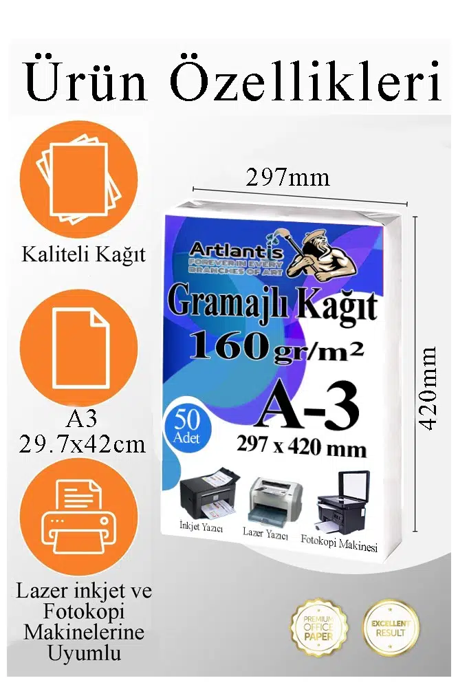 Ürün Adı: Artlantis A3 Gramajlı Fotokopi Kağıdı 50 Adet 160 gr Sertifika Kağıdı Kalın Kağıt Baskı Tüm Yazıcılara Uyumlu 29.7x42cm Ofis Büro