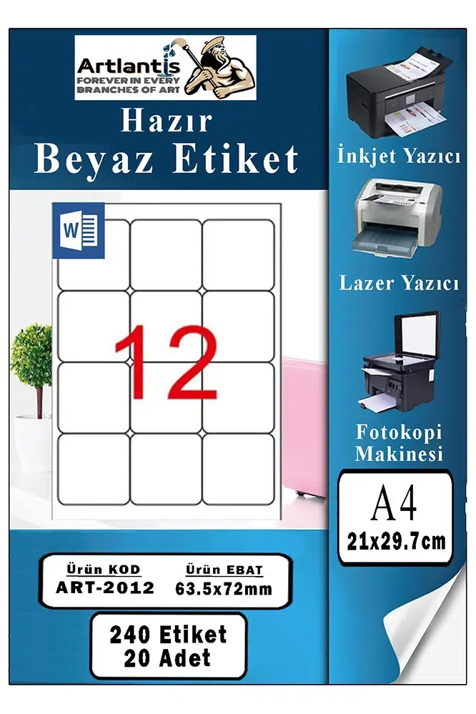 Ürün Adı: Artlantis A4 12 li Hazır Etiket 63.5x72 mm 20 Sayfa 1 Paket Kendinden Yapışkanlı Fotokopi Lazer İnkjet Kağıdı Yazıcılar İçin Uyumlu Mokel Kod : 2012