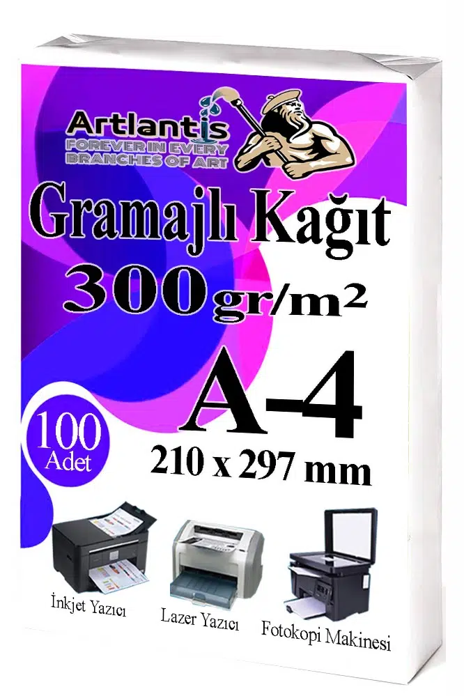 - Artlantis A4 Sertifika Kağıdı Kalın Kartuşlu Mürekkepli Tüm Yazıcılara Uygun 300 gr. (Tüm Yazıcılar için Optimum kalınlıktadır.) A4 (21cmx29.7cm) Sıvı Mürekkepli Yazıcılarda Dağılma Problemi olmaz. Mürekkebi hemen emer. Kartuşlu ve Lazer tüm yazıcılara uygundur.
