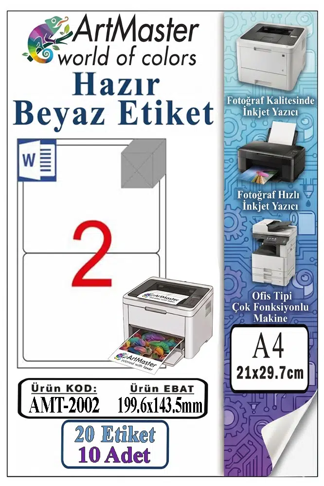 Ürün Adı: ArtMaster A4 Hazır Beyaz Etiket 199.6x143.5mm 10 Sayfa 1 Paket 2 li Kendinden Yapışkanlı Fotokopi Lazer İnkjet Kağıdı Yazıcılara Uyumlu
