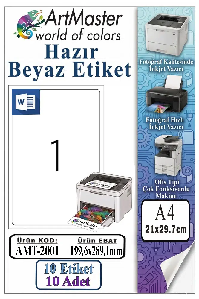 Ürün Adı: ArtMaster A4 Hazır Beyaz Etiket 199.6x289.1mm 10 Sayfa 1 Paket Kendinden Yapışkanlı Fotokopi Lazer İnkjet Kağıdı Yazıcılara Uyumlu