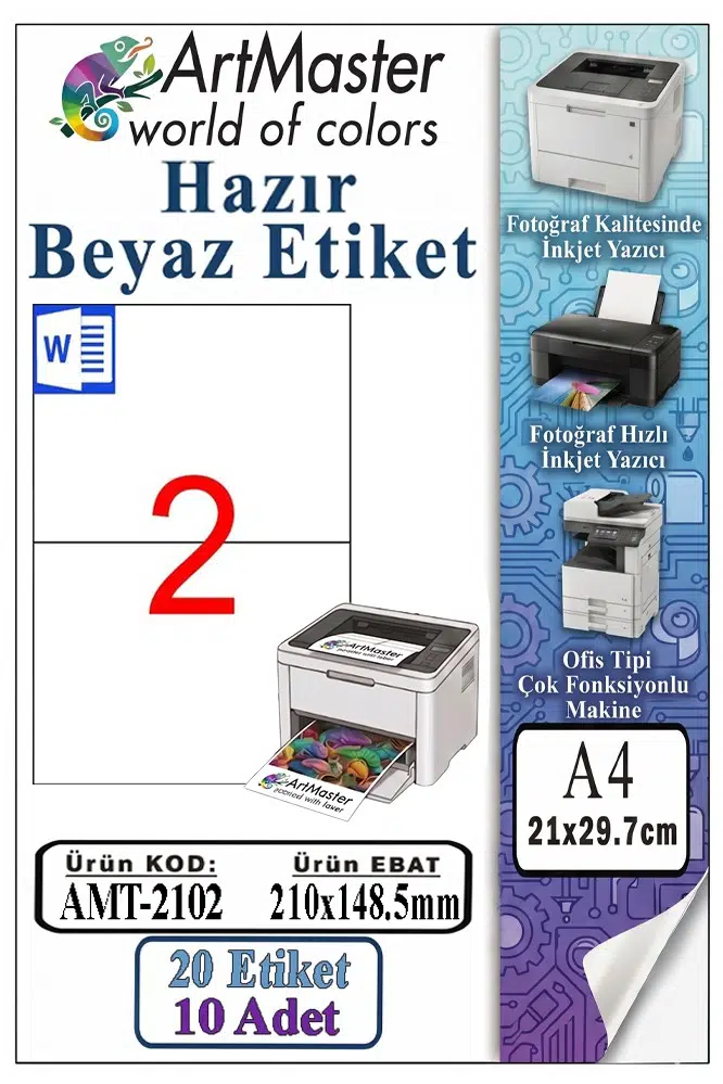 Ürün Adı: ArtMaster A4 Hazır Beyaz Etiket 210x148.5mm 10 Sayfa 1 Paket 2 li Kendinden Yapışkanlı Fotokopi Lazer İnkjet Kağıdı Yazıcılar İçin