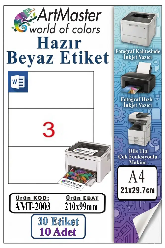 Ürün Adı: ArtMaster A4 Hazır Beyaz Etiket 210x99 mm 10 Sayfa 1 Paket 3 lü Kendinden Yapışkanlı Fotokopi Lazer İnkjet Kağıdı Yazıcılar İçin