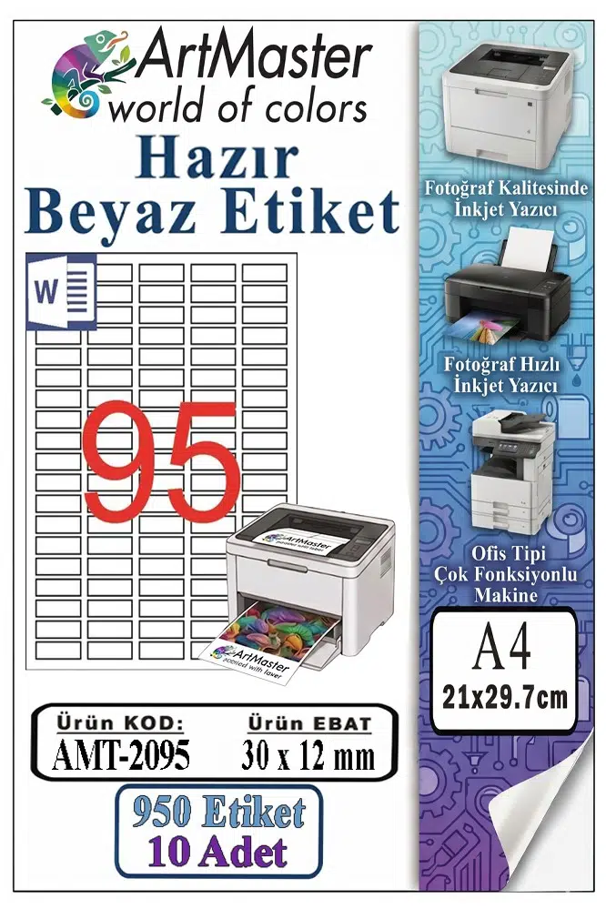 Ürün Adı: ArtMaster A4 Hazır Beyaz Etiket 30x12mm 10 Sayfa 1 Paket 95 li Yapışkanlı Fotokopi Lazer İnkjet Kağıdı Yazıcılar İçin Uyumlu