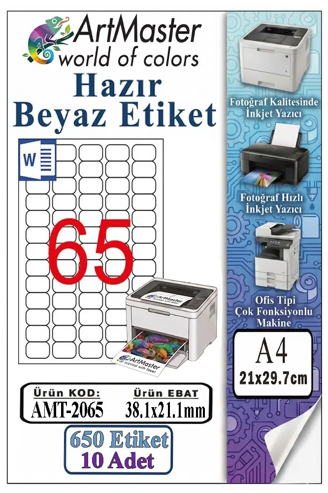 Ürün Adı: ArtMaster A4 Hazır Beyaz Etiket 38.1x21.2mm 10 Sayfa 1 Paket 65 li Yapışkanlı Fotokopi Lazer İnkjet Kağıdı Yazıcılar İçin Uyumlu