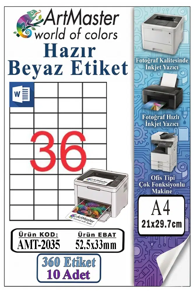 Ürün Adı: ArtMaster A4 Hazır Beyaz Etiket 52.5x33mm 10 Sayfa 1 Paket 36 lı Kendinden Yapışkanlı Fotokopi Lazer İnkjet Kağıdı Yazıcılar İçin Uyumlu
