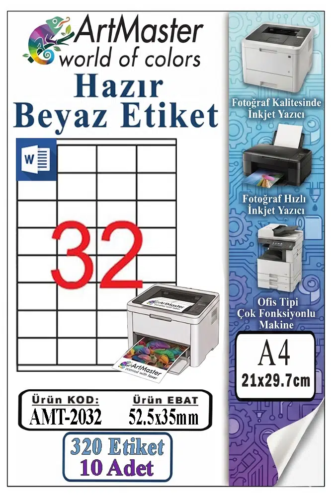 Ürün Adı: ArtMaster A4 Hazır Beyaz Etiket 52.5x35mm 10 Sayfa 1 Paket 32 li Kendinden Yapışkanlı Fotokopi Lazer İnkjet Kağıdı Yazıcılar İçin Uyumlu