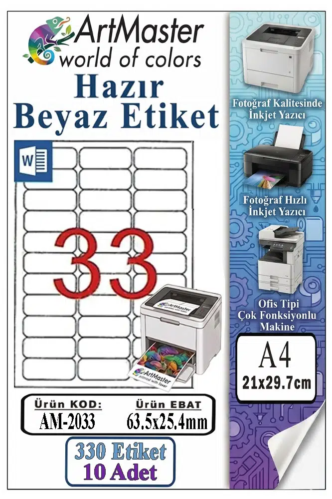 Ürün Adı: ArtMaster A4 Hazır Beyaz Etiket 63.5x25.4mm 10 Sayfa 1 Paket 33 lü Kendinden Yapışkanlı Fotokopi Lazer İnkjet Kağıdı Yazıcılarla Uyumlu