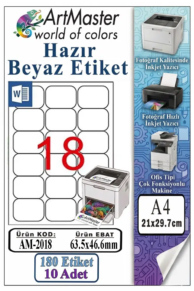 Ürün Adı: ArtMaster A4 Hazır Beyaz Etiket 63.5x46.6mm 10 Sayfa 1 Paket 18 li Kendinden Yapışkanlı Fotokopi Lazer İnkjet Kağıdı Yazıcılarla Uyumlu