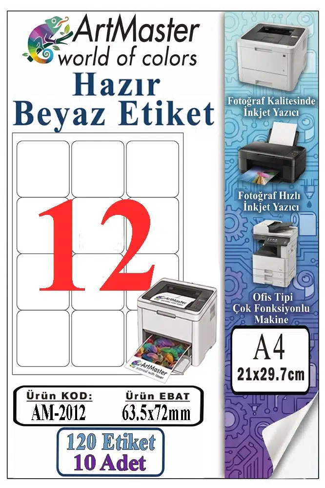 Ürün Adı: ArtMaster A4 Hazır Beyaz Etiket 63.5x72mm 10 Sayfa 1 Paket 12 li Kendinden Yapışkanlı Fotokopi Lazer İnkjet Kağıdı Yazıcılar İçin Uyumlu