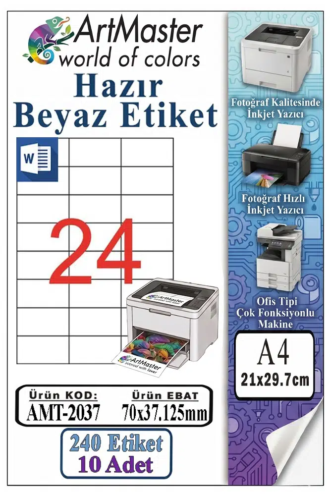Ürün Adı: ArtMaster A4 Hazır Beyaz Etiket 70x37.12mm 10 Sayfa 1 Paket 24 lü Kendinden Yapışkanlı Fotokopi Lazer İnkjet Kağıdı Yazıcılar Uygun