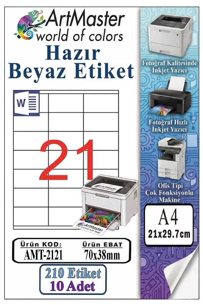 Ürün Adı: ArtMaster A4 Hazır Beyaz Etiket 70x38mm 10 Sayfa 1 Paket 21 li Kendinden Yapışkanlı Fotokopi Lazer İnkjet Kağıdı Yazıcılar İçin Uyumlu