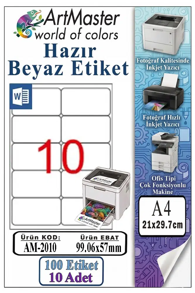 Ürün Adı: ArtMaster A4 Hazır Beyaz Etiket 99.06x57 mm 10 Sayfa 1 Paket 10 lu Kendinden Yapışkanlı Fotokopi Lazer İnkjet Kağıdı Yazıcılar İle Uyumlu