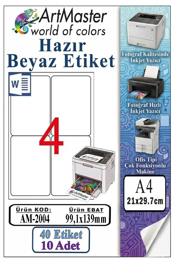 Ürün Adı: ArtMaster A4 Hazır Beyaz Etiket 99.1x139mm 10 Sayfa 1 Paket 4 lü Kendinden Yapışkanlı Fotokopi Lazer İnkjet Kağıdı Yazıcılar İle Uyumlu