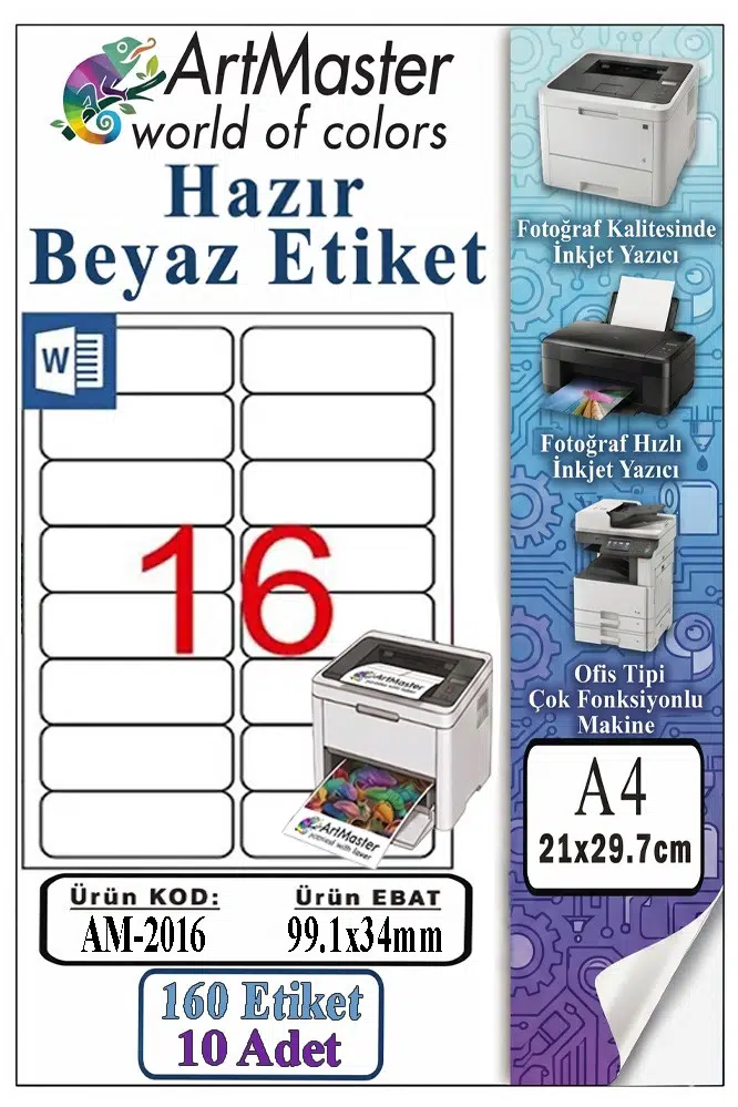 Ürün Adı: ArtMaster A4 Hazır Beyaz Etiket 99.1x34mm 10 Sayfa 1 Paket 16 lı Kendinden Yapışkanlı Fotokopi Lazer İnkjet Kağıdı Yazıcılar İçin Uyumlu