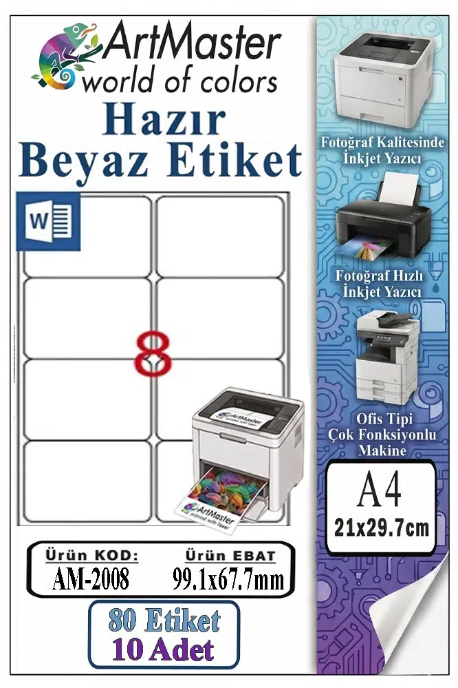 Ürün Adı: ArtMaster A4 Hazır Beyaz Etiket 99.1x67.7mm 10 Sayfa 1 Paket 8 li Kendinden Yapışkanlı Fotokopi Lazer İnkjet Kağıdı Yazıcılarla Uyumlu