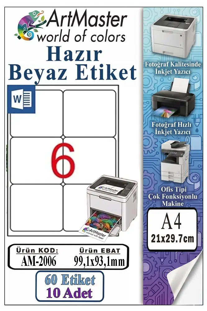 Ürün Adı: ArtMaster A4 Hazır Beyaz Etiket 99.1x93.1mm 10 Sayfa 6 lı 1 Paket Kendinden Yapışkanlı Fotokopi Lazer İnkjet Kağıdı Yazıcılarla Uyumlu