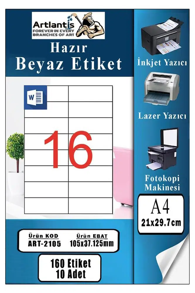 Ürün Adı: A4 Hazır Etiket 105x37.1 mm 10 Sayfa 1 Paket 16 lı Kendinden Yapışkanlı Fotokopi Lazer İnkjet Kağıdı Yazıcılar İçin Uyumlu Mokel Kod : 2105