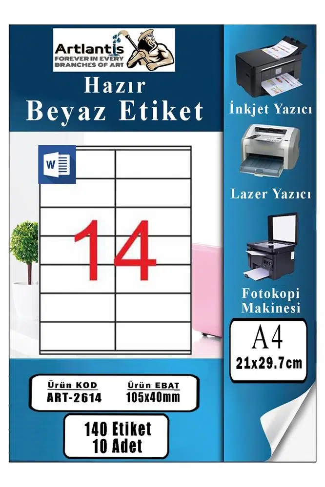 Ürün Adı: A4 Hazır Etiket 105x40 mm 10 Sayfa 1 Paket 14 lü Kendinden Yapışkanlı Fotokopi Lazer İnkjet Kağıdı Yazıcılar İçin Uyumlu Model Kod : 2614