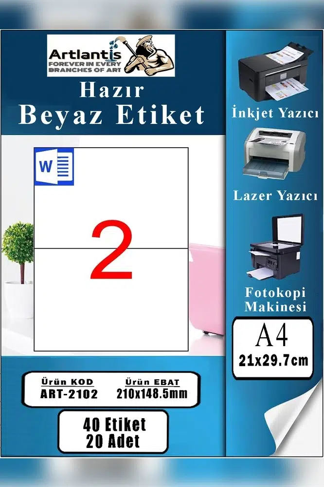 Ürün Adı: Artlantis A4 Hazır Etiket 210x148.5 mm 20 Sayfa 1 Paket 2 li Kendinden Yapışkanlı Fotokopi Lazer İnkjet Kağıdı Yazıcılar İçin Uyumlu Mokel Kod : 2102