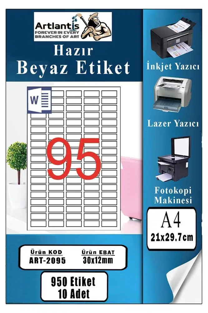Ürün Adı: A4 Hazır Etiket 30x12 mm 10 Sayfa 1 Paket 95 li Kendinden Yapışkanlı Fotokopi Lazer İnkjet Kağıdı Yazıcılar İçin Uyumlu Mokel Kod : 2095