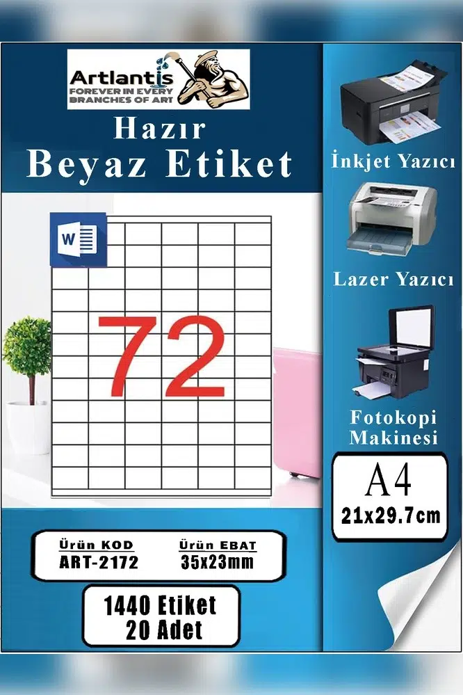 Ürün Adı: Artlantis A4 Hazır Etiket 35x23 mm 20 Sayfa 1 Paket 72 li Kendinden Yapışkanlı Fotokopi Lazer İnkjet Kağıdı Yazıcılar İçin Uyumlu Mokel Kod : 2172