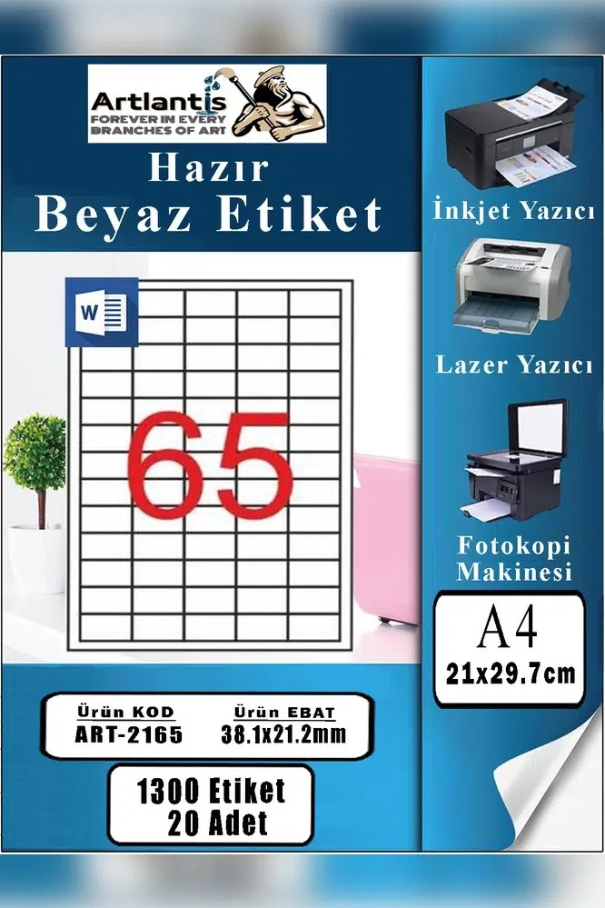 Ürün Adı: Artlantis A4 Hazır Etiket 38.1x21.2 mm 20 Sayfa 1 Paket 65 li Kendinden Yapışkanlı Fotokopi Lazer İnkjet Kağıdı Yazıcılar İçin Uyumlu Mokel Kod : 2165